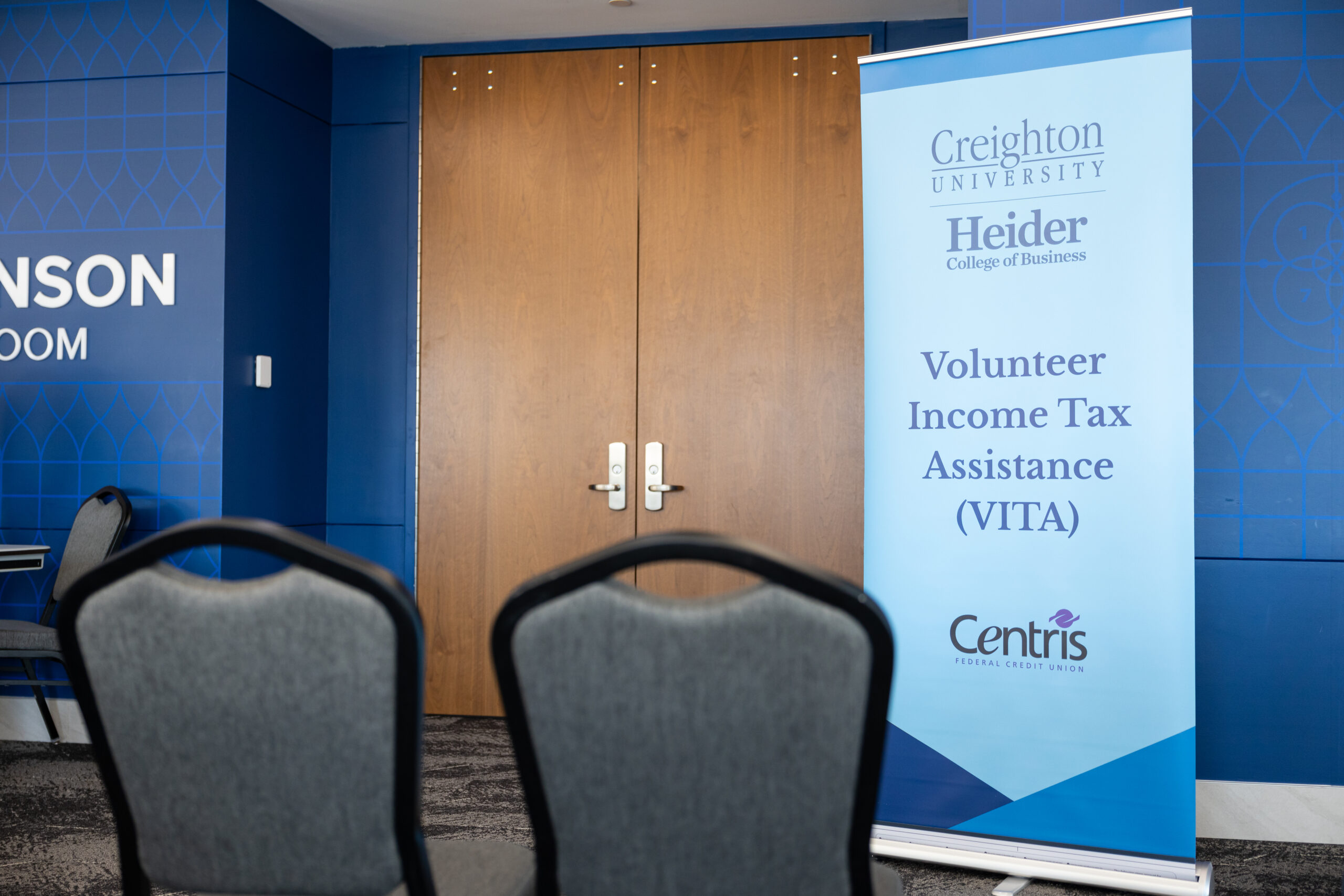 The poster advertises Creighton Universityβs student-run Volunteer Income Tax Assistance (VITA) clinics, held in the Heider College of Business building on campus. The program provided free tax preparation services to Omaha area residents earning $67,000 or less annually.