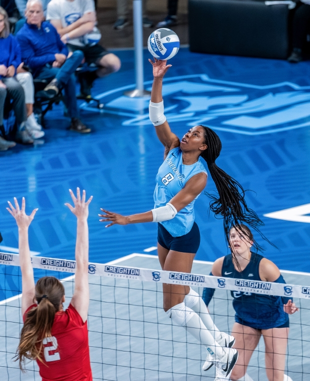 The newest middle for the Jays is junior Ayden Ames. Coming from the University of Texas, Ames led the Longhorns on their Elite 8 run with 109 blocks on the season. Against Nebraska, she finished the match with seven kills and experienced her first time in the Creighton atmosphere at D.J. Sokol Arena.
